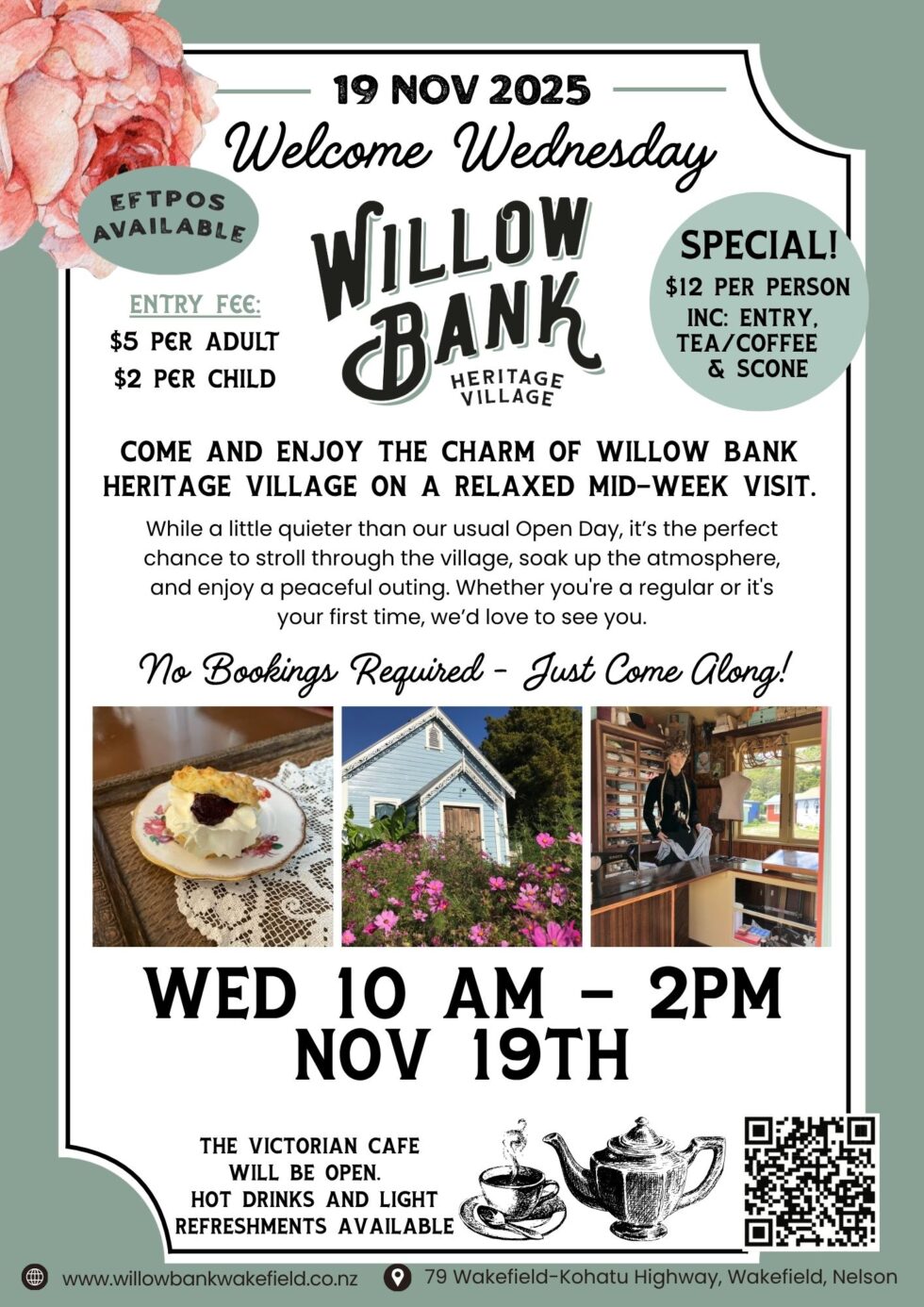 Welcome Wednesday Special $12 inc Entry, Tea or Coffee and a Scone filled with Cream and Willow Bank Raspberry Jam