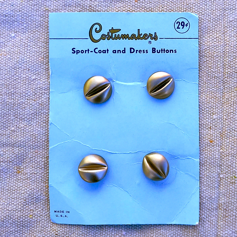 History of Costumakers Buttons: Costumakers Buttons was a brand possibly active in the mid-20th century, known for its mother-of-pearl buttons made of plastic and other materials for use on garments. They were likely sold alongside other popular brands such as La Mode, advertised in Vogue Pattern Book magazine, and represented the shift from natural materials such as shells to mass-produced plastic buttons that emerged in the mid-20th century.