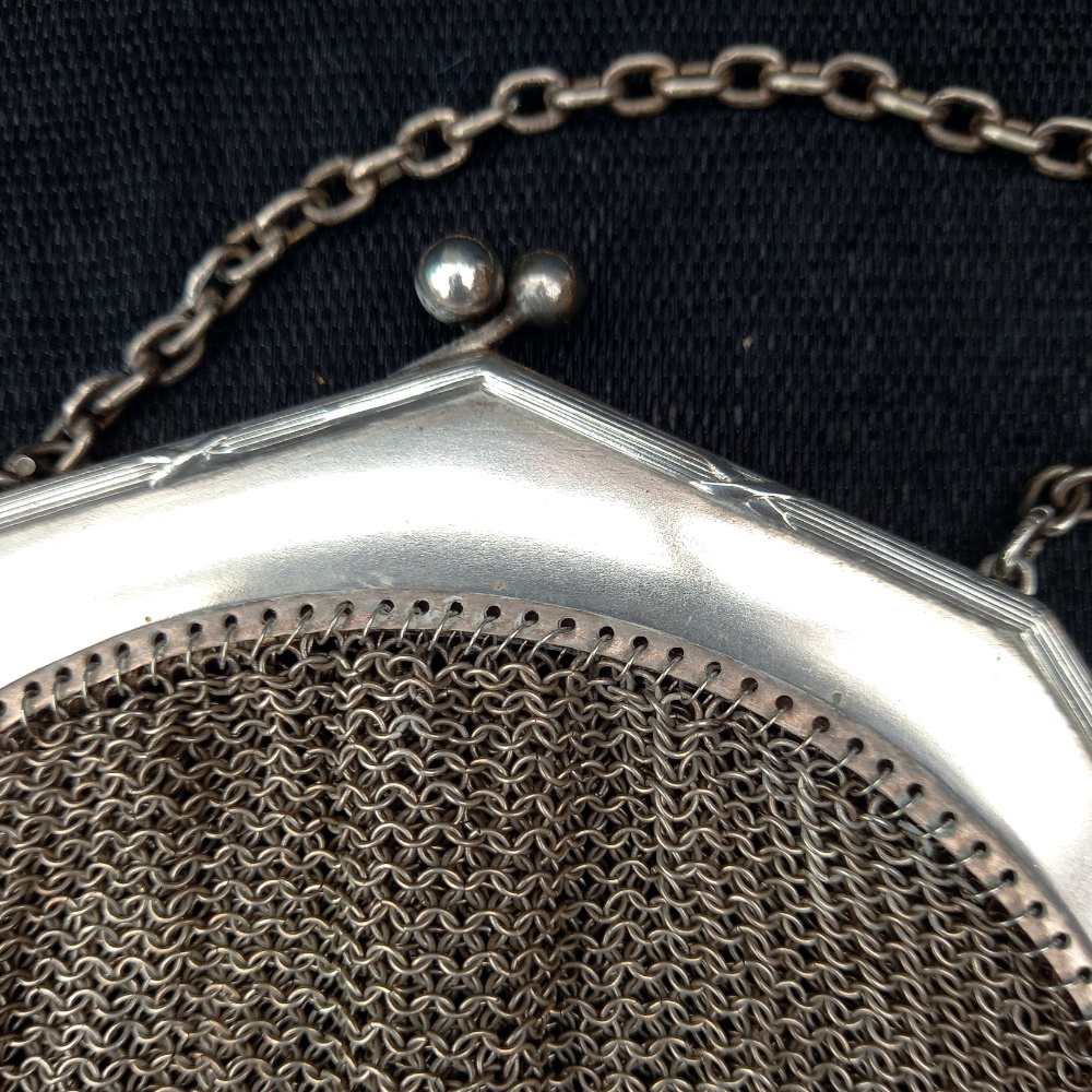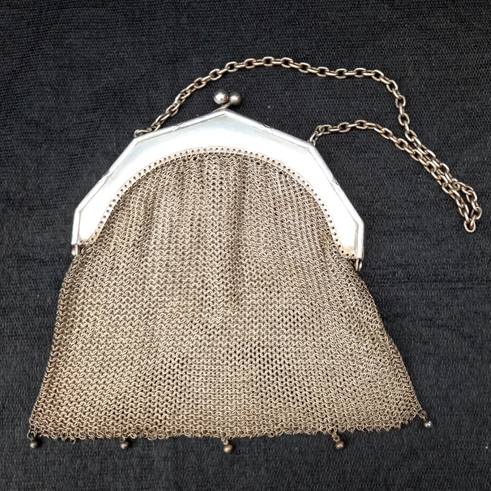 Description: Antique Alpacca K & K silver mesh purse, dating to the early 1900s. Made from alpacca (nickel silver), a durable alloy designed to resemble silver, it features a delicate chainmail-style mesh and metal frame. Mesh purses like this were fashionable evening accessories during the late Victorian and Edwardian periods and were often used for coins or small personal items.