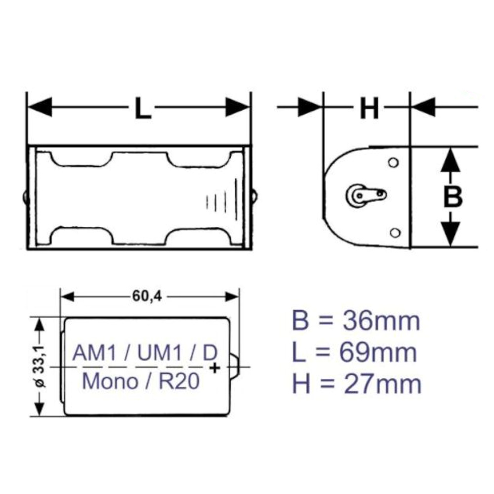 Battery Holder Plastic with Solder Lugs for 1x D (ANDC-004)