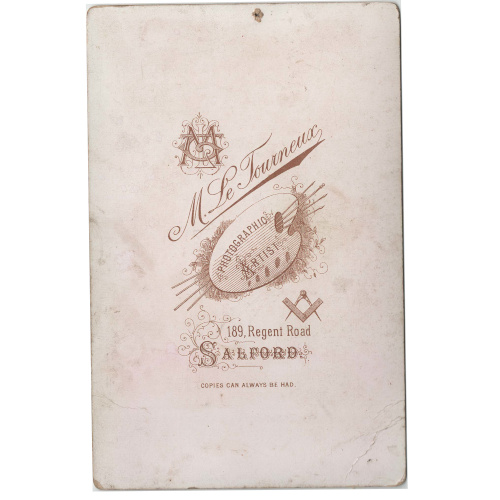 Margaret Le Tourneux was a Victorian photographer who operated a studio at 189 Regent Road in Salford, United Kingdom, between 1870 and 1880. The Freemason symbol of the square-and-compass is depicted on the reverse side of this cabinet card.