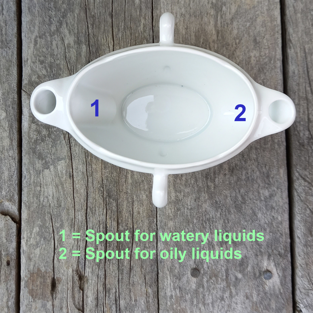 Description: This gravy boat features two spouts: one designed to pour the flavorful liquid beneath, and the other to pour the oil that naturally rises to the top. This clever design works because oil floats on top of the gravy, allowing you to separate and serve each layer with ease.