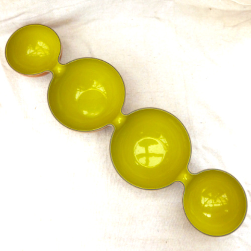 Description: A classic 1970s melamine serving bowl featuring a rich avocado green interior and a faux wood grain exterior. Designed in a Caleppio-inspired style, this divided dish includes four compartments—ideal for serving snacks, chips, nuts, or condiments. Lightweight, durable, and full of retro charm.