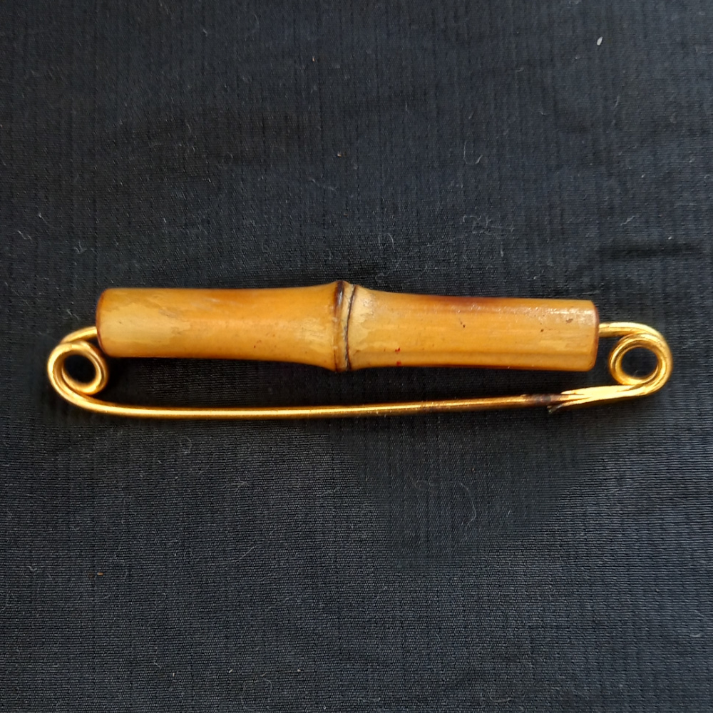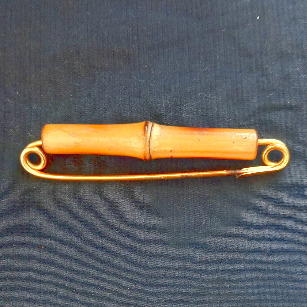 Description: The pin is made of brass and features a piece of bamboo. It can be worn as a pin to secure a kilt, wool scarf, or wool jacket.