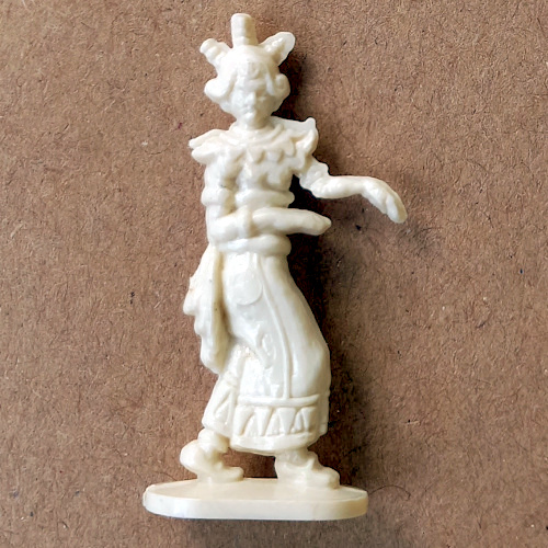 History about margarine figurines: In 1950, Fri-Homa—one of Germany’s leading margarine brands owned by Fritz Homann—began adding small prizes to its packages to build customer loyalty. The first plastic figures were produced by the SIKU toy company, run by Homann’s friend Richard Sieper, and the idea quickly spread across the industry. These prizes were typically molded in a light cream polystyrene to resemble miniature ivory carvings. The practice ended in 1954, when German producers agreed to stop including in-pack toys. For many post-war children, these small figures were their only toys for years.