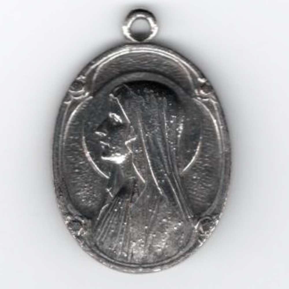 Description: Vintage silver-plated oval medal pendant religious, Catholic, of Saint Bernadette, Lourdes, France, Saint Bernadette Charm.