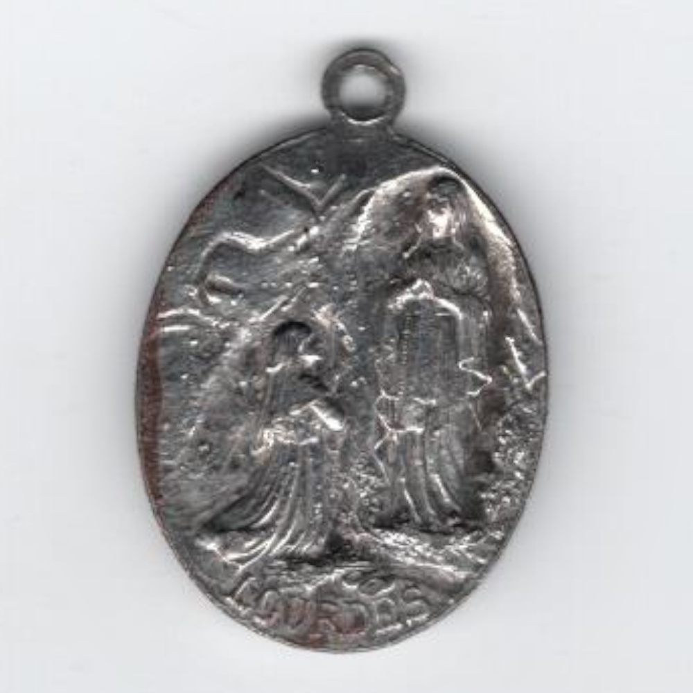History on Lourdes Medals / Souvenir Charms, Bernadette Soubirous, a young peasant girl in Lourdes, France. In 1858, she reported multiple apparitions of the Virgin Mary at the Grotto of Massabielle.