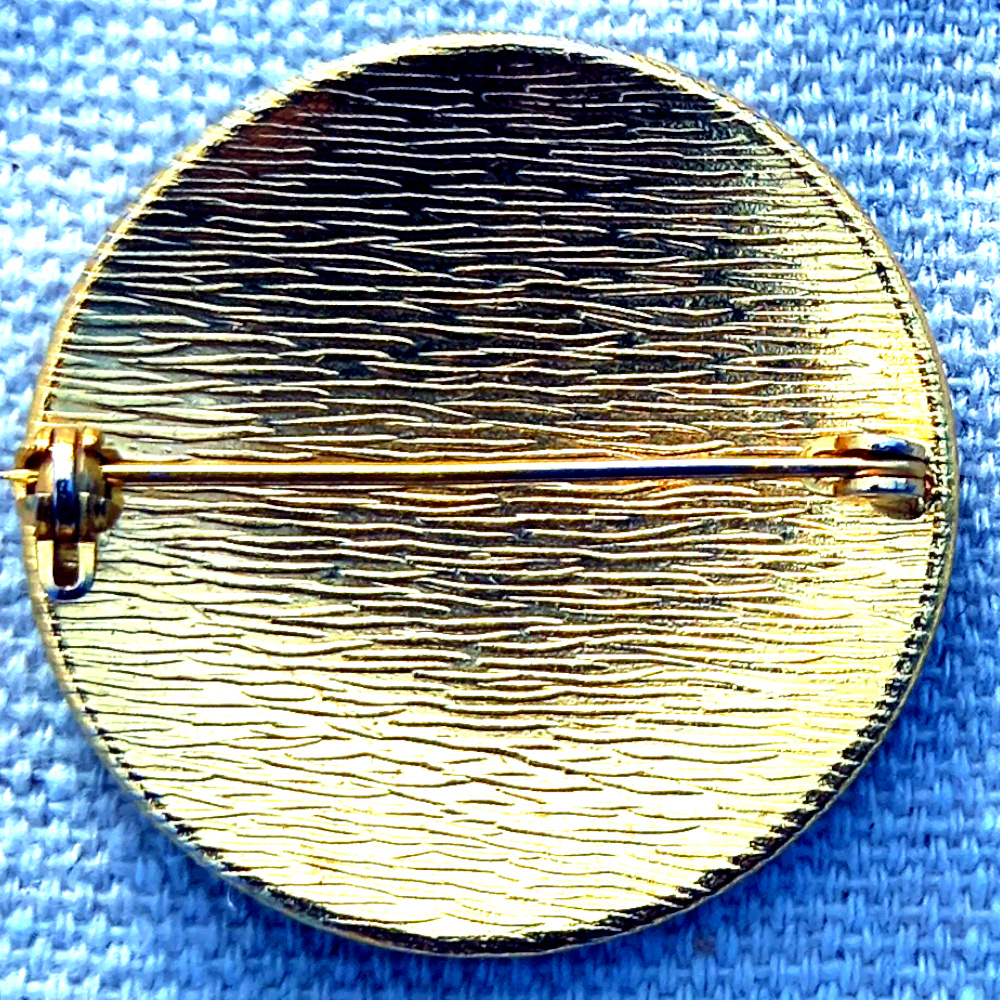 Description: Round Toledo Damascene brooch. The ornament depicts a bird, four flowers, and a bee-like creature. The brooch has a roll-over safety pin on the back.